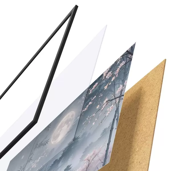 Das Poster besteht aus einem Rahmen, Plexiglas, einem gedruckten Bild und einer Rückwand aus Spanplatten. Dank der Halterungen auf der Rückseite kann das Poster sofort an die Wand gehängt werden.