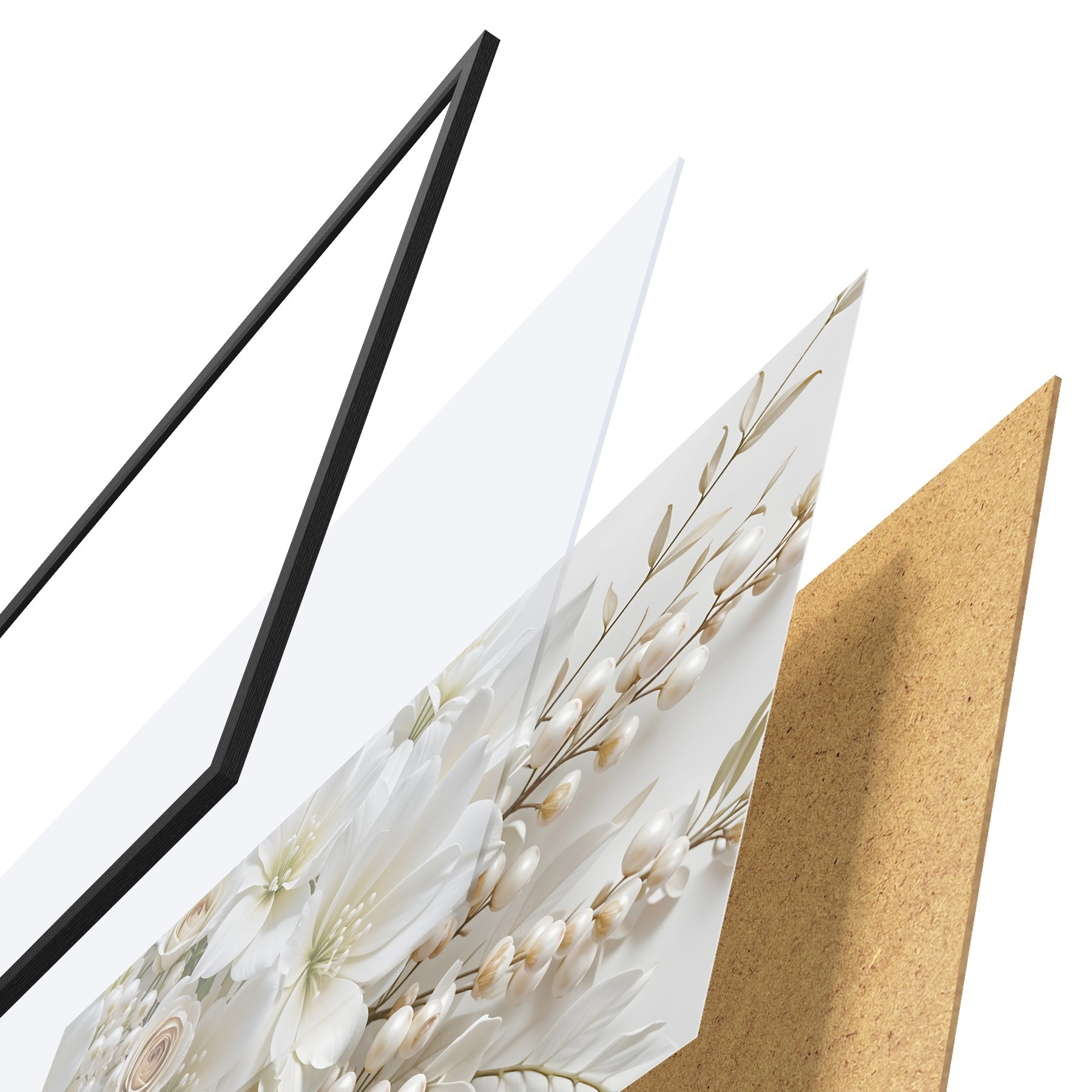 Poster Zarte weiße Blumen, darunter Lilien, Rosen und andere Blüten mit weichen, samtigen Blütenblättern Nr f41722