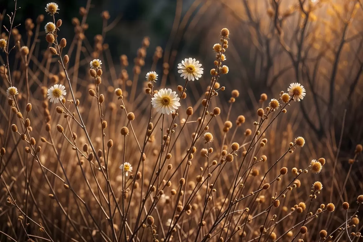 Poster Weiße Gänseblümchen in einem Feld aus vertrocknetem Gras und Stängeln, im warmen Abendsonnenlicht Nr f41735