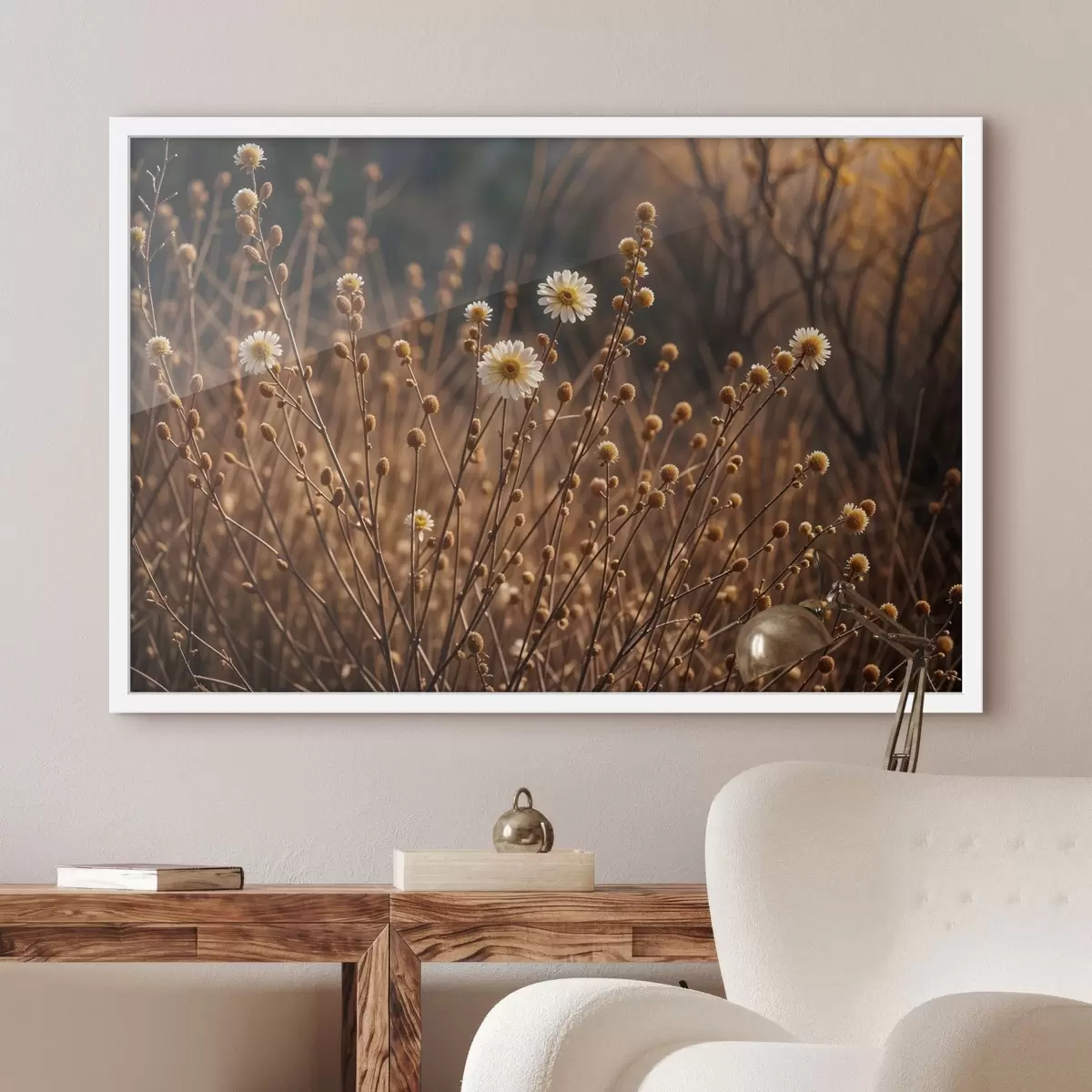 Poster Weiße Gänseblümchen in einem Feld aus vertrocknetem Gras und Stängeln, im warmen Abendsonnenlicht f41735