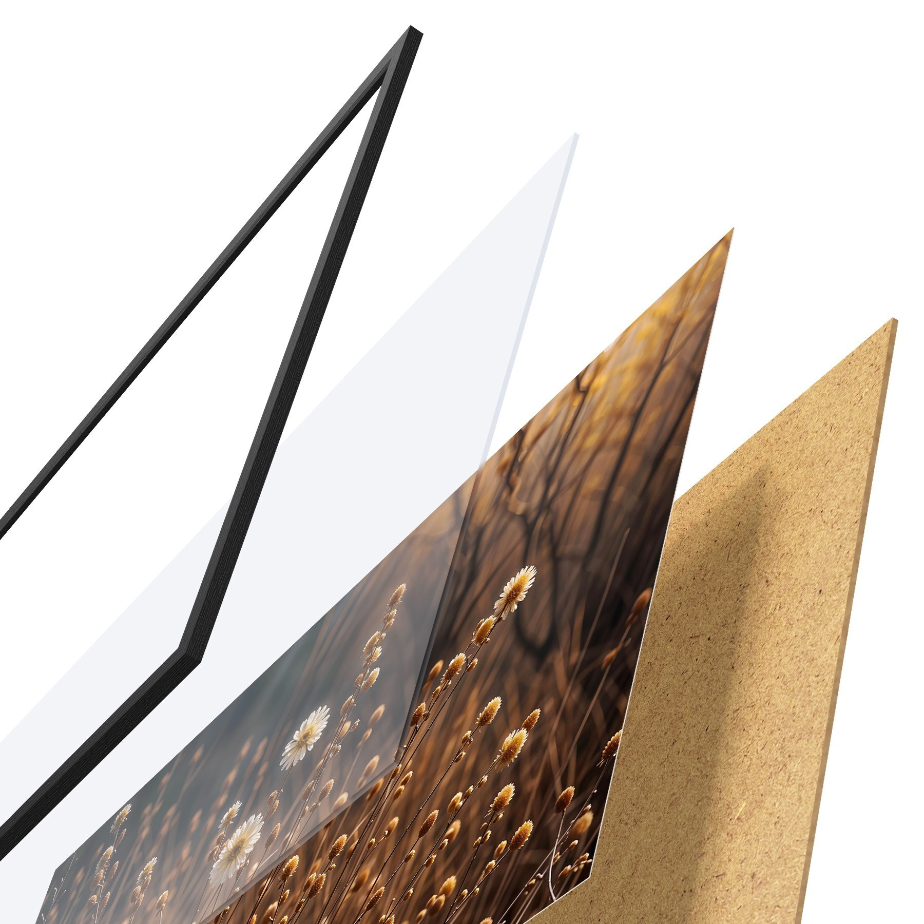 Das Poster besteht aus einem Rahmen, Plexiglas, einem gedruckten Bild und einer Rückwand aus Spanplatten. Dank der Halterungen auf der Rückseite kann das Poster sofort an die Wand gehängt werden.