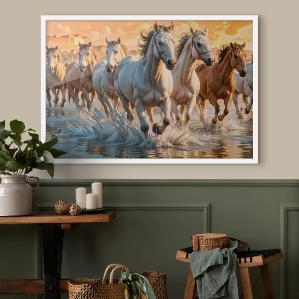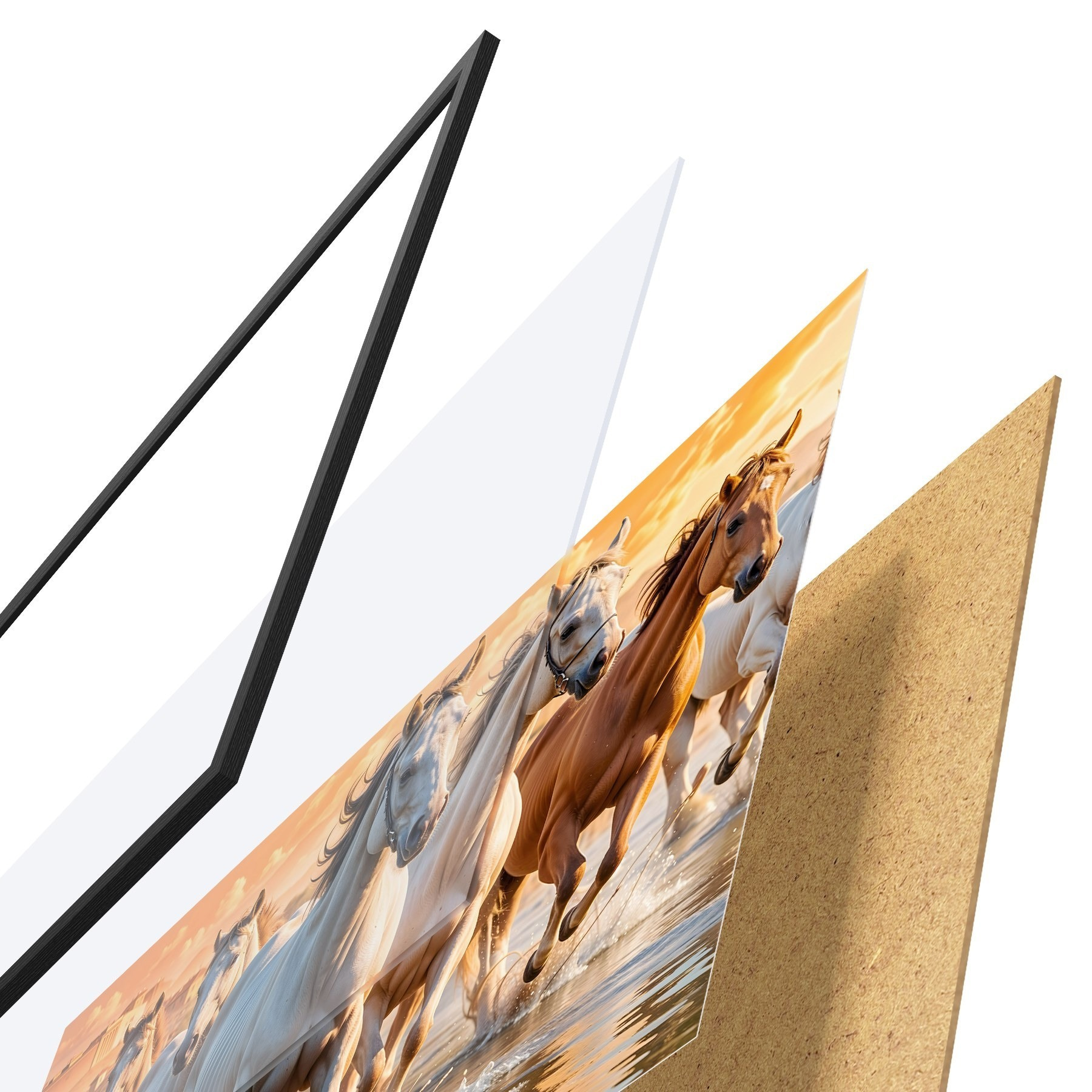 Poster Eine Herde weißer Pferde, die durch seichtes Wasser laufen, mit einem orangefarbenen Himmel im Hintergrund f41740