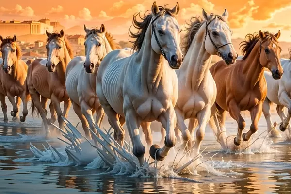 Poster Eine Herde weißer Pferde, die durch seichtes Wasser laufen, mit einem orangefarbenen Himmel im Hintergrund f41740