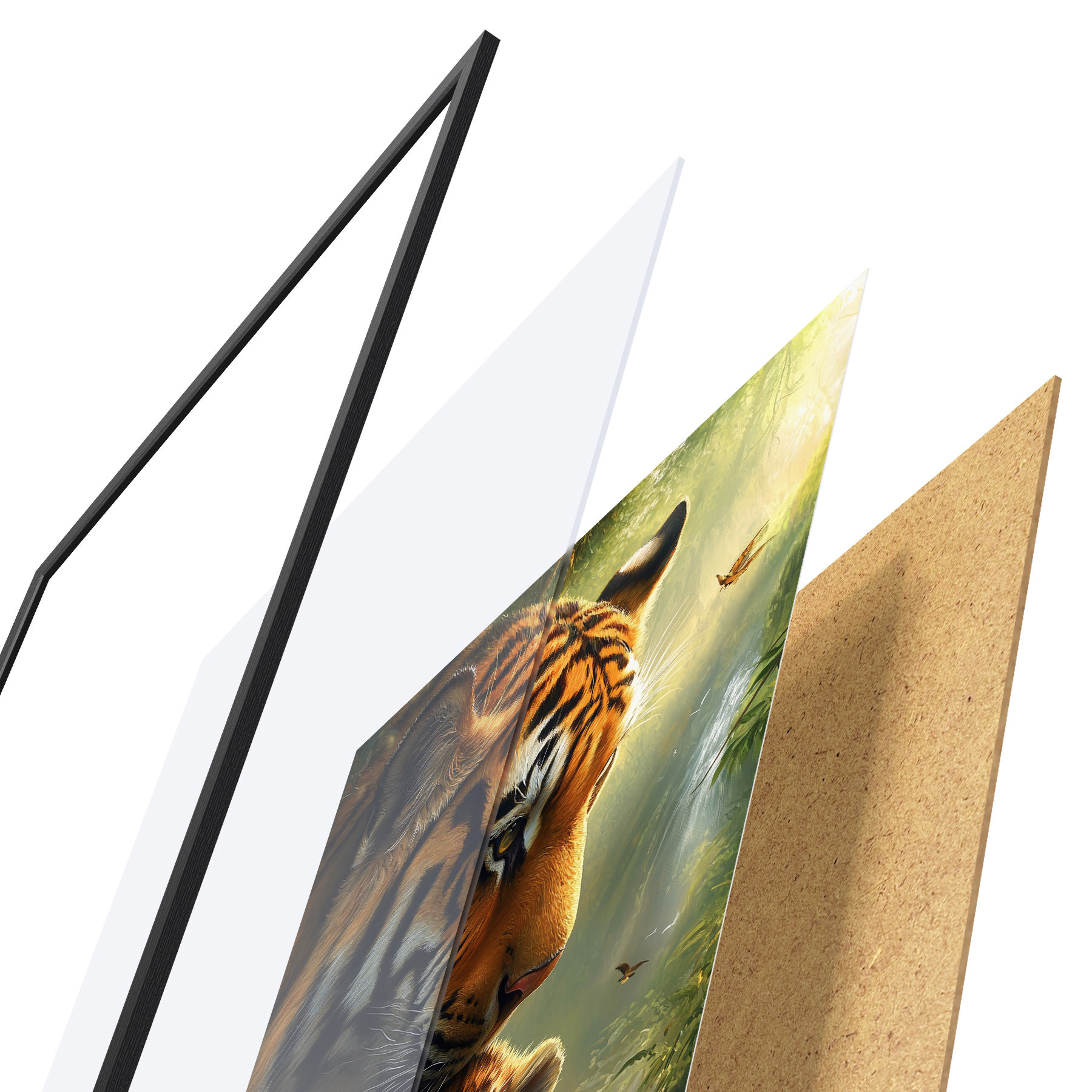 Das Poster besteht aus einem Rahmen, Plexiglas, einem gedruckten Bild und einer Rückwand aus Spanplatten. Dank der Halterungen auf der Rückseite kann das Poster sofort an die Wand gehängt werden.