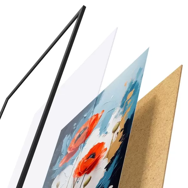 Das Poster besteht aus einem Rahmen, Plexiglas, einem gedruckten Bild und einer Rückwand aus Spanplatten. Dank der Halterungen auf der Rückseite kann das Poster sofort an die Wand gehängt werden.