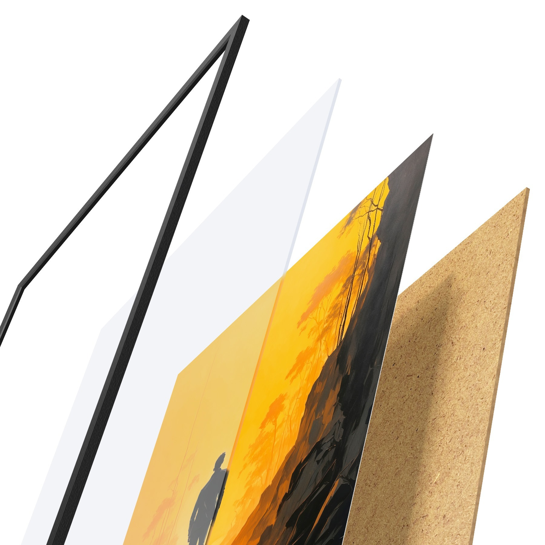 Das Poster besteht aus einem Rahmen, Plexiglas, einem gedruckten Bild und einer Rückwand aus Spanplatten. Dank der Halterungen auf der Rückseite kann das Poster sofort an die Wand gehängt werden.