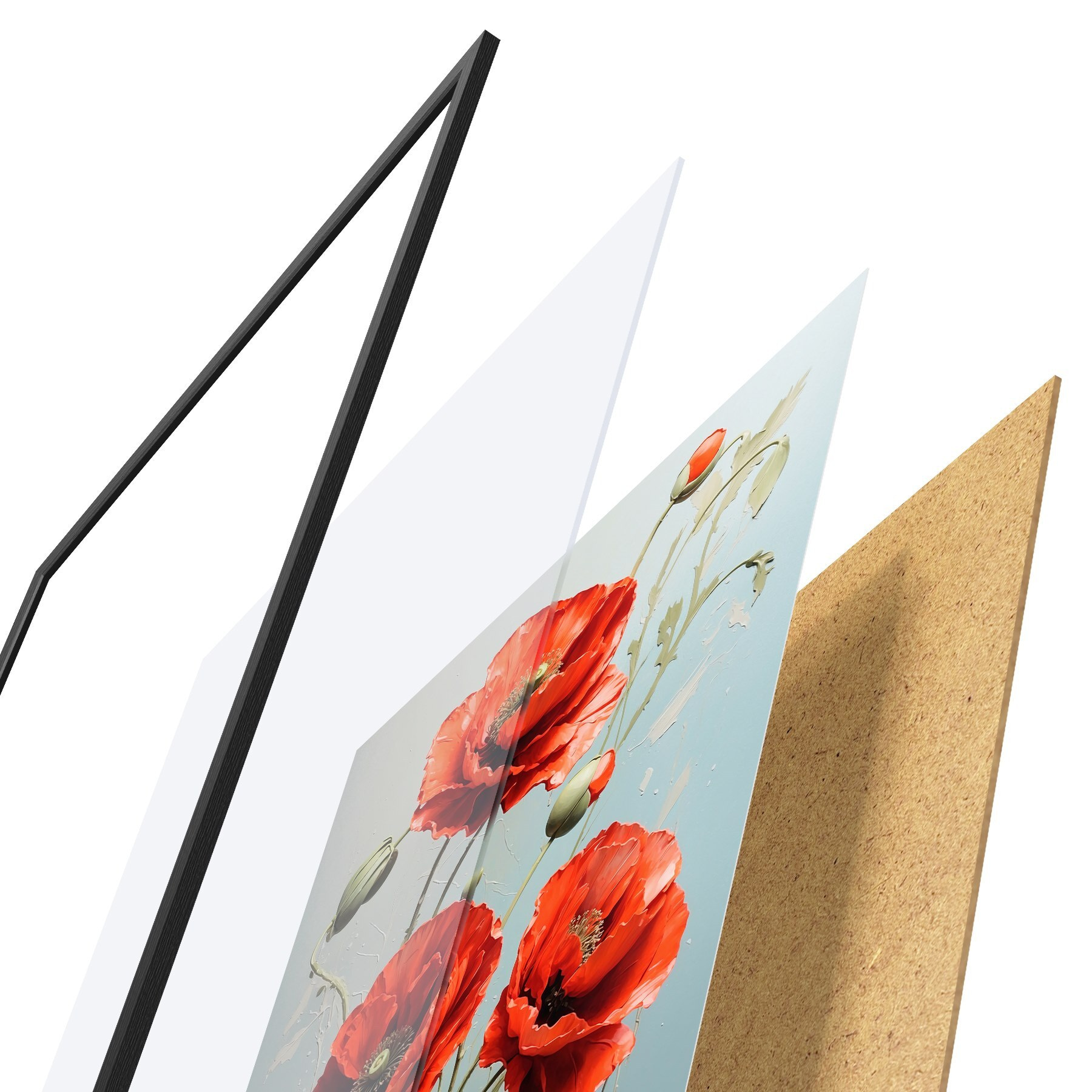 Das Poster besteht aus einem Rahmen, Plexiglas, einem gedruckten Bild und einer Rückwand aus Spanplatten. Dank der Halterungen auf der Rückseite kann das Poster sofort an die Wand gehängt werden.
