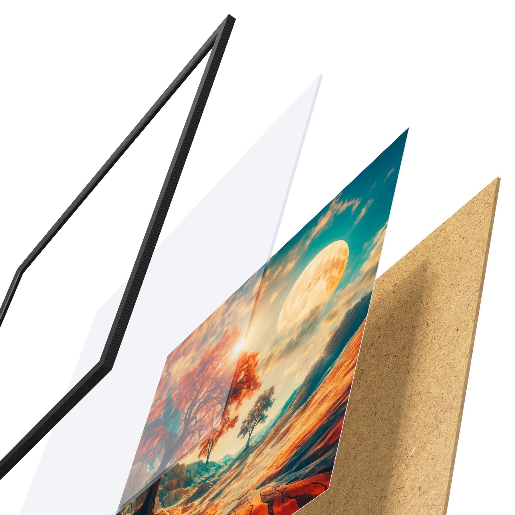 Das Poster besteht aus einem Rahmen, Plexiglas, einem gedruckten Bild und einer Rückwand aus Spanplatten. Dank der Halterungen auf der Rückseite kann das Poster sofort an die Wand gehängt werden.