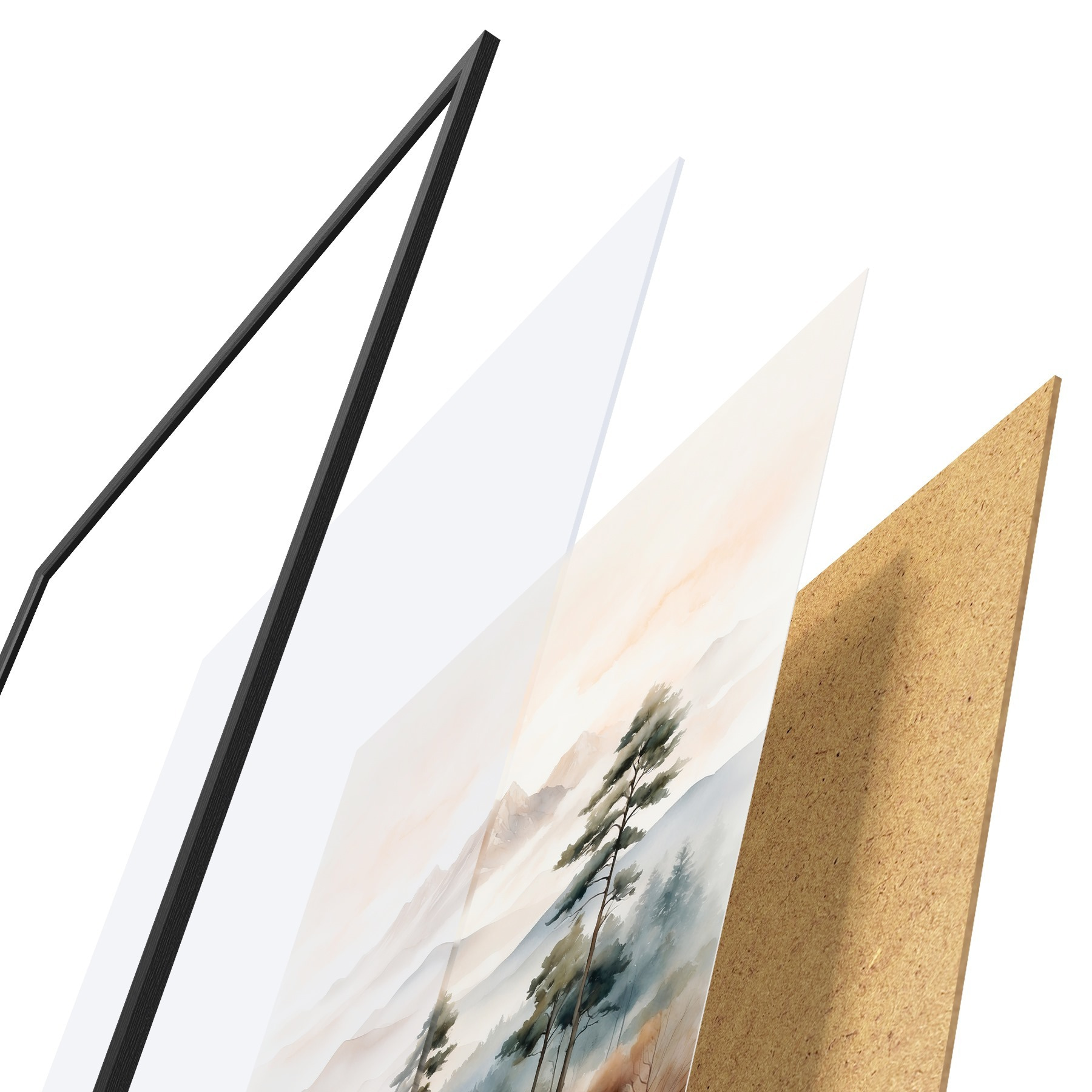 Das Poster besteht aus einem Rahmen, Plexiglas, einem gedruckten Bild und einer Rückwand aus Spanplatten. Dank der Halterungen auf der Rückseite kann das Poster sofort an die Wand gehängt werden.