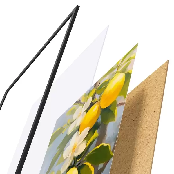 Das Poster besteht aus einem Rahmen, Plexiglas, einem gedruckten Bild und einer Rückwand aus Spanplatten. Dank der Halterungen auf der Rückseite kann das Poster sofort an die Wand gehängt werden.