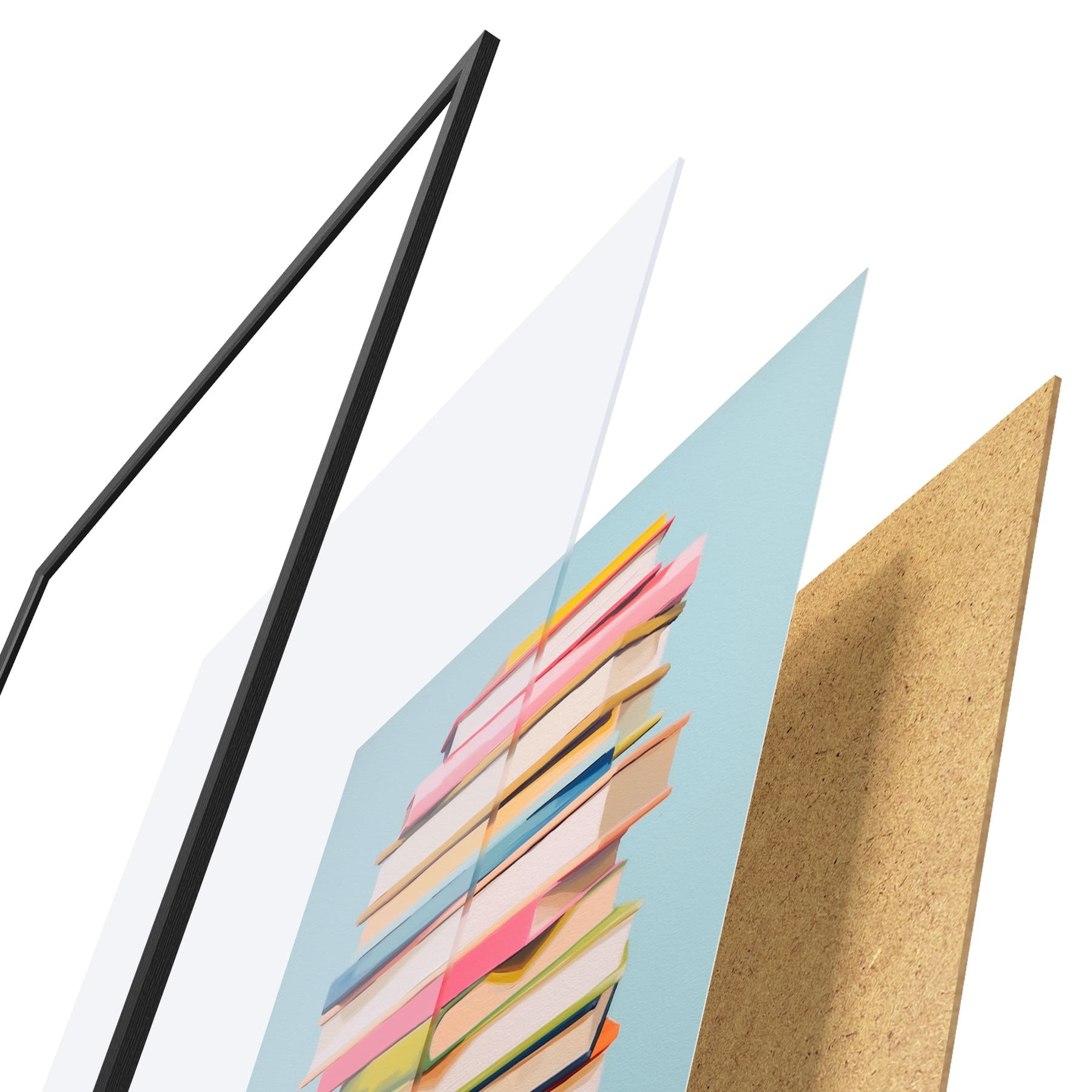 Das Poster besteht aus einem Rahmen, Plexiglas, einem gedruckten Bild und einer Rückwand aus Spanplatten. Dank der Halterungen auf der Rückseite kann das Poster sofort an die Wand gehängt werden.