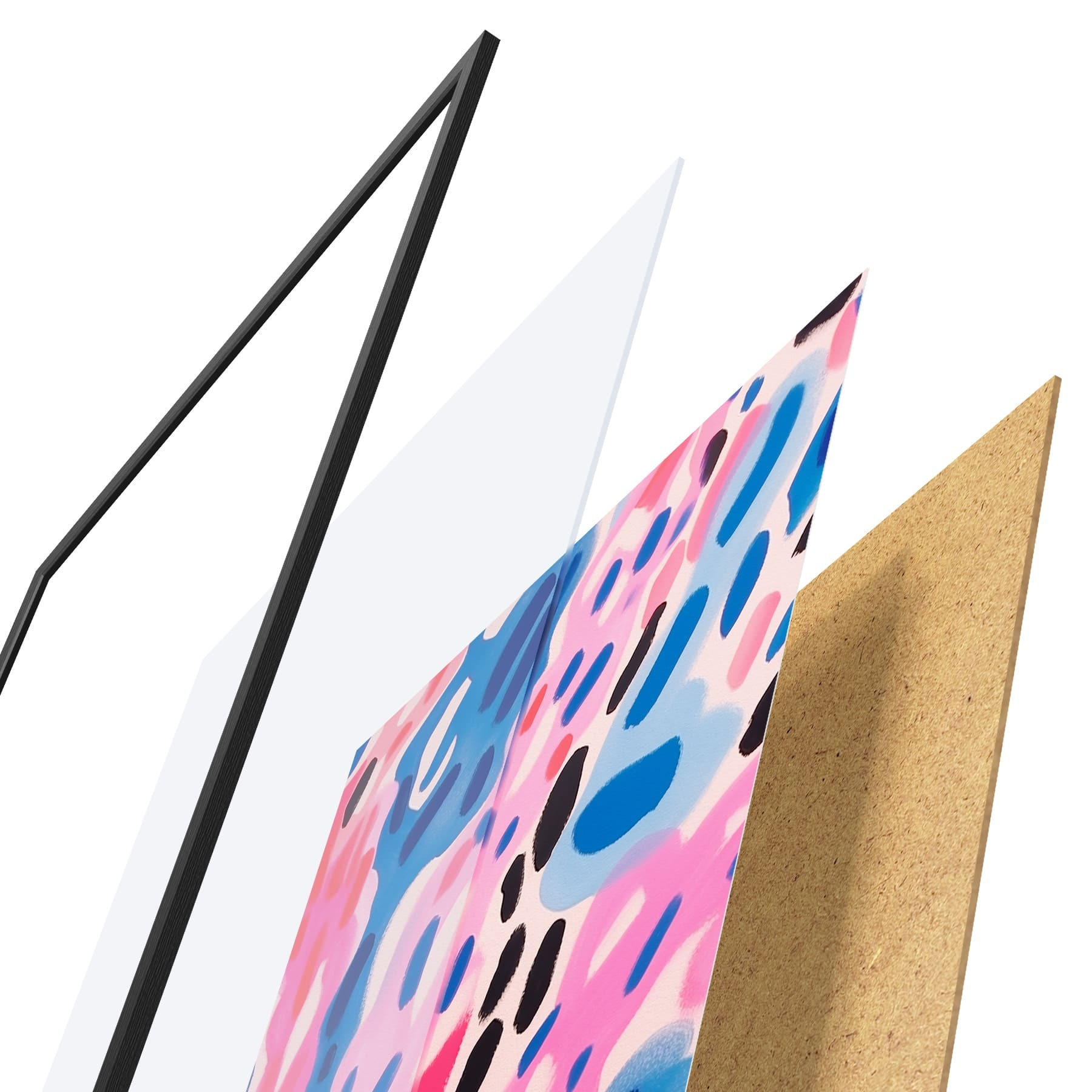 Das Poster besteht aus einem Rahmen, Plexiglas, einem gedruckten Bild und einer Rückwand aus Spanplatten. Dank der Halterungen auf der Rückseite kann das Poster sofort an die Wand gehängt werden.