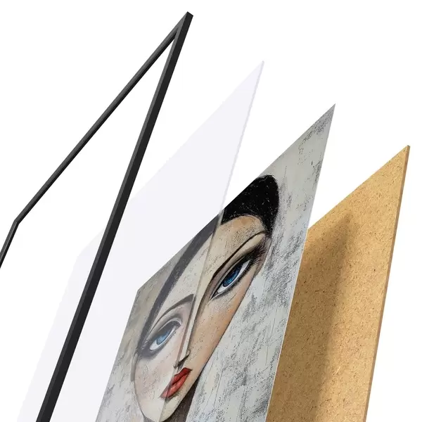 Das Poster besteht aus einem Rahmen, Plexiglas, einem gedruckten Bild und einer Rückwand aus Spanplatten. Dank der Halterungen auf der Rückseite kann das Poster sofort an die Wand gehängt werden.