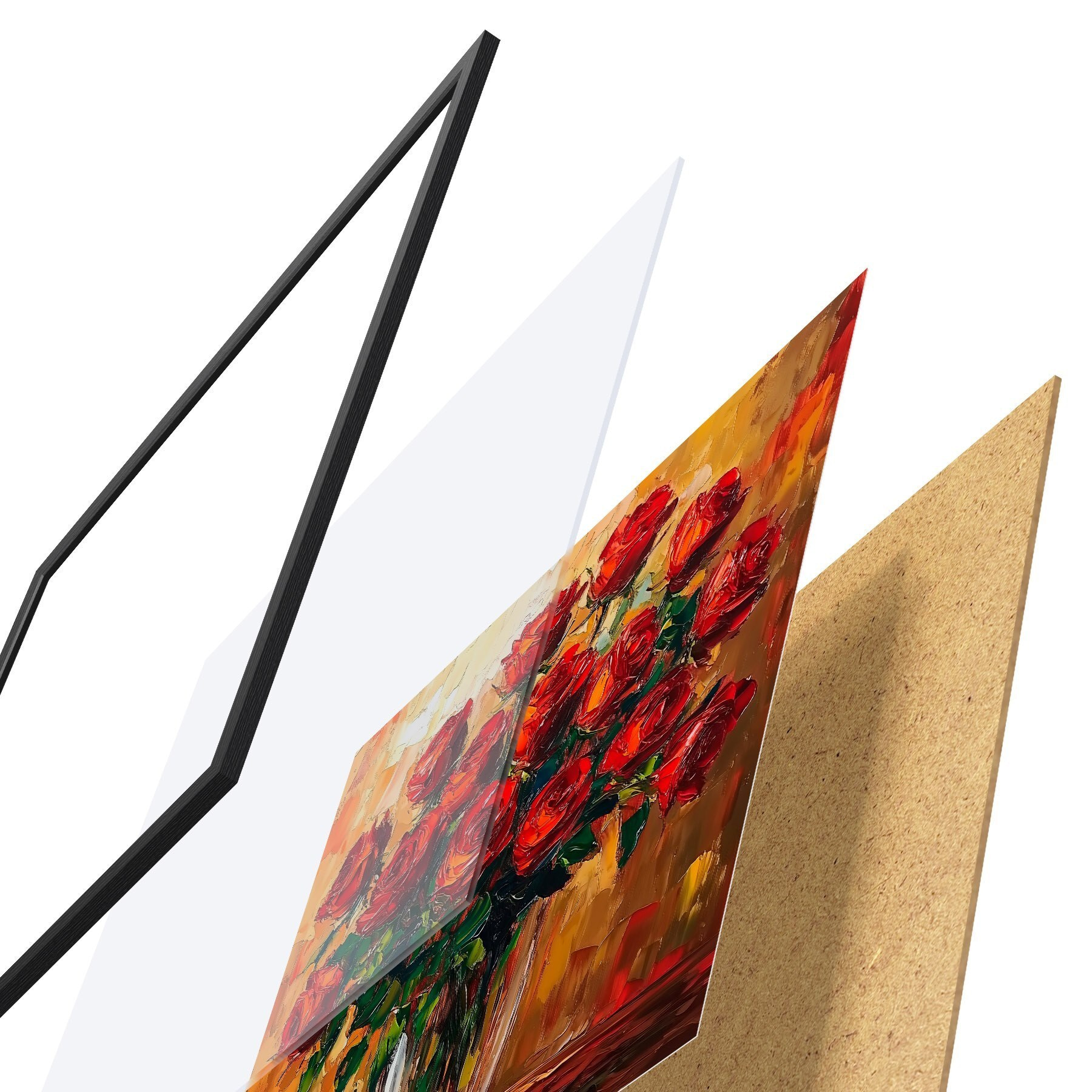 Das Poster besteht aus einem Rahmen, Plexiglas, einem gedruckten Bild und einer Rückwand aus Spanplatten. Dank der Halterungen auf der Rückseite kann das Poster sofort an die Wand gehängt werden.