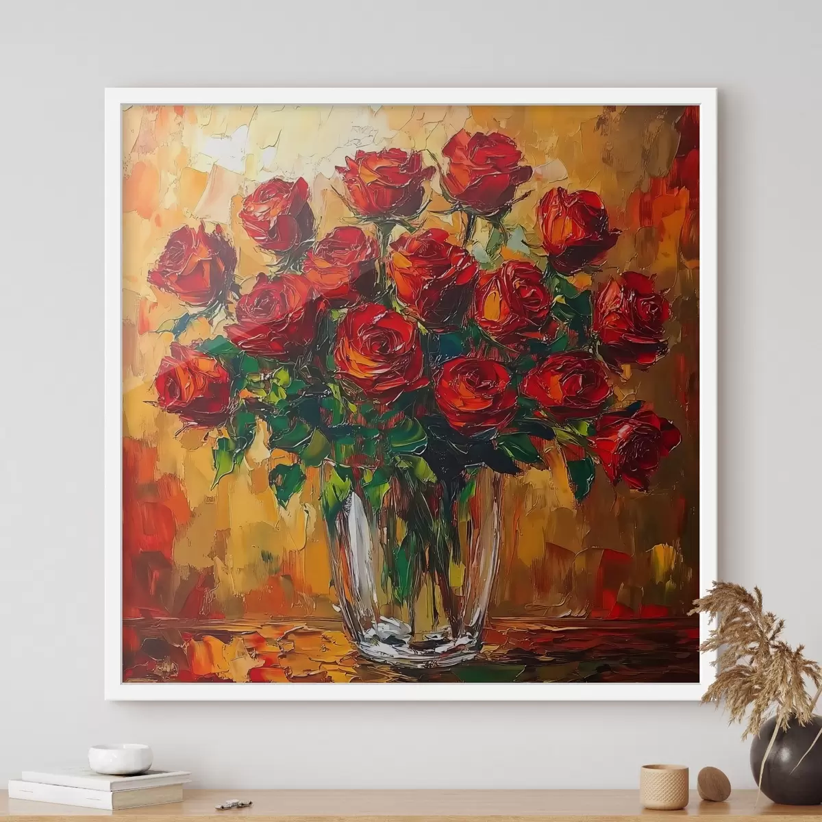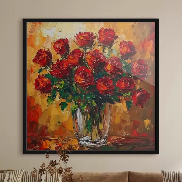 Poster Rote Rosen in einer transparenten Vase auf einem warmen Hintergrund Nr f41816