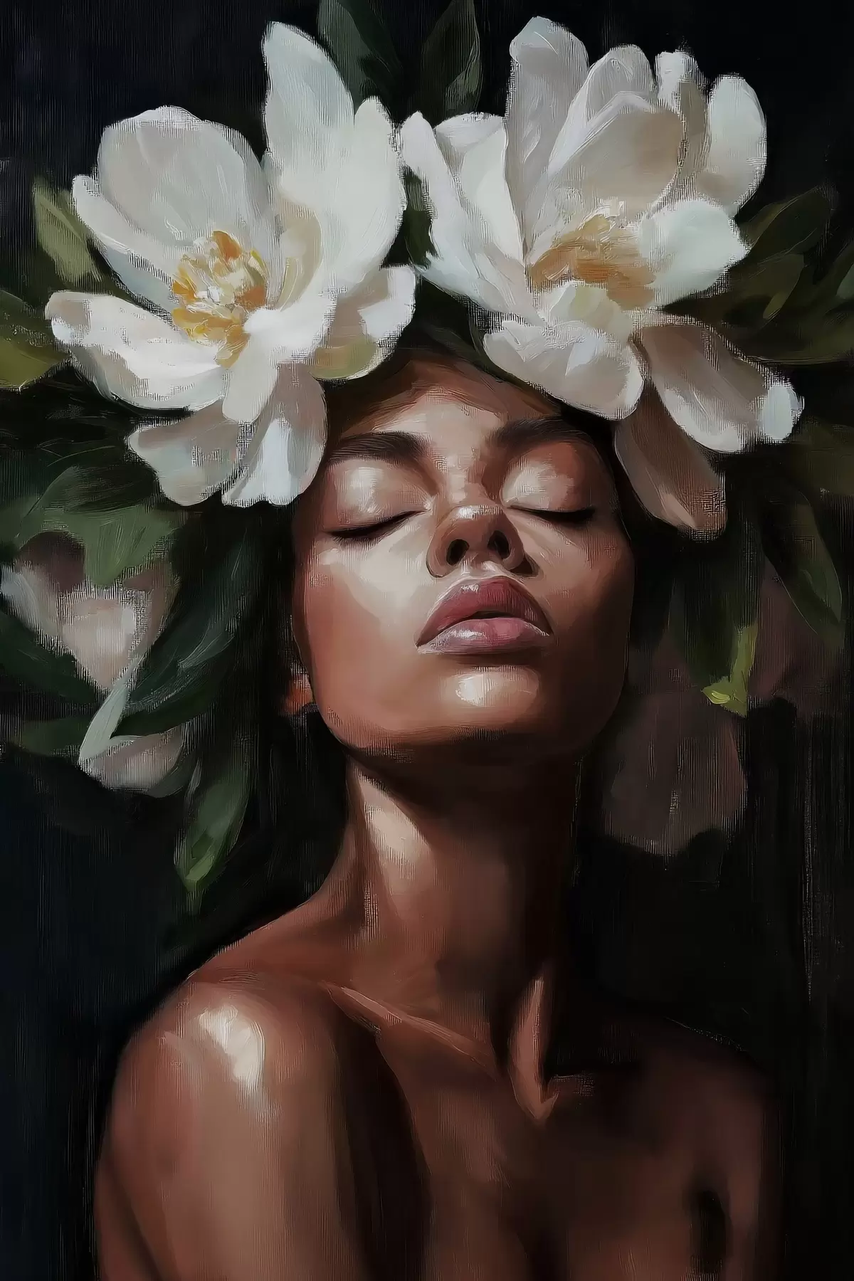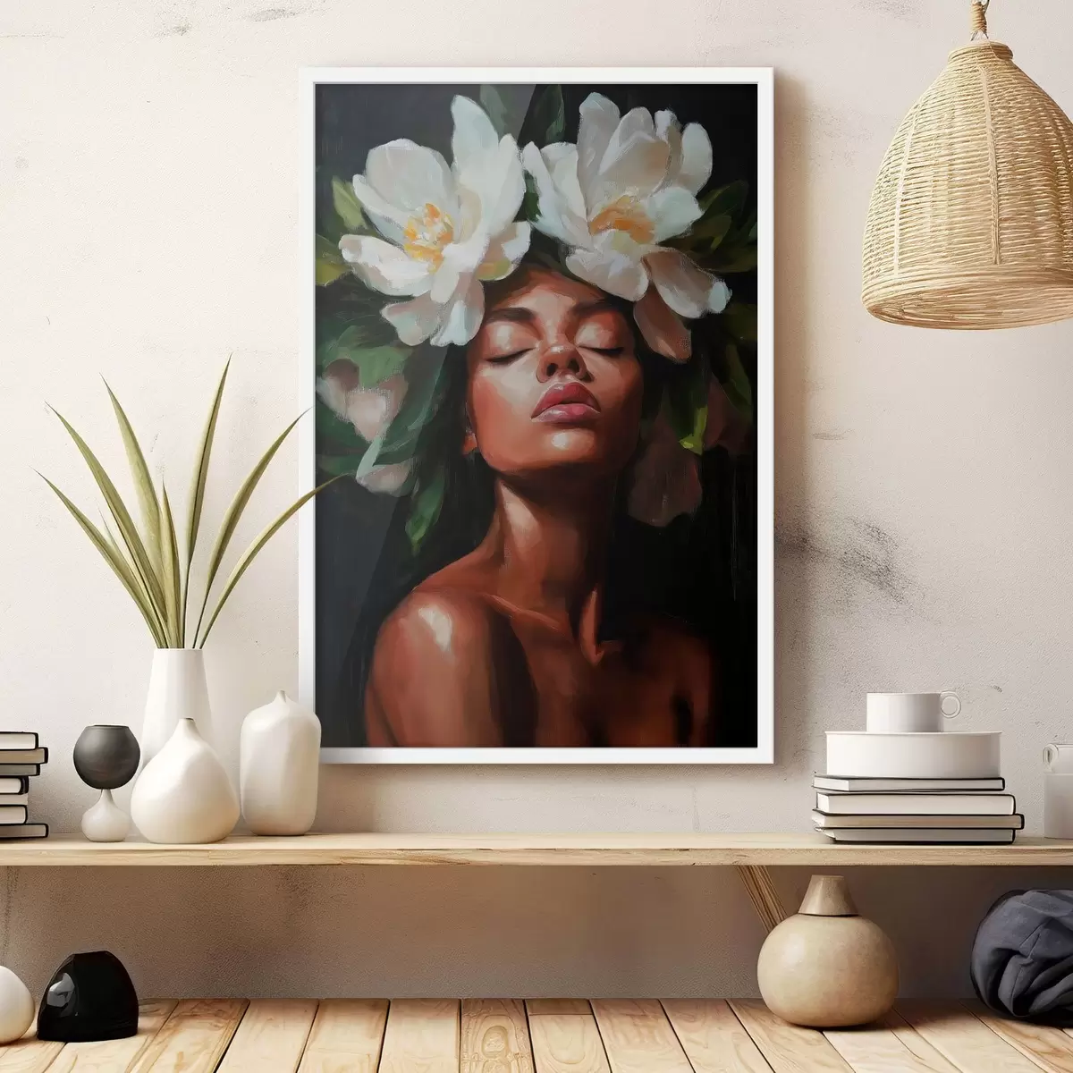 Poster Frauenporträt mit weißen Blumen im Haar auf dunklem Hintergrund Nr f41824