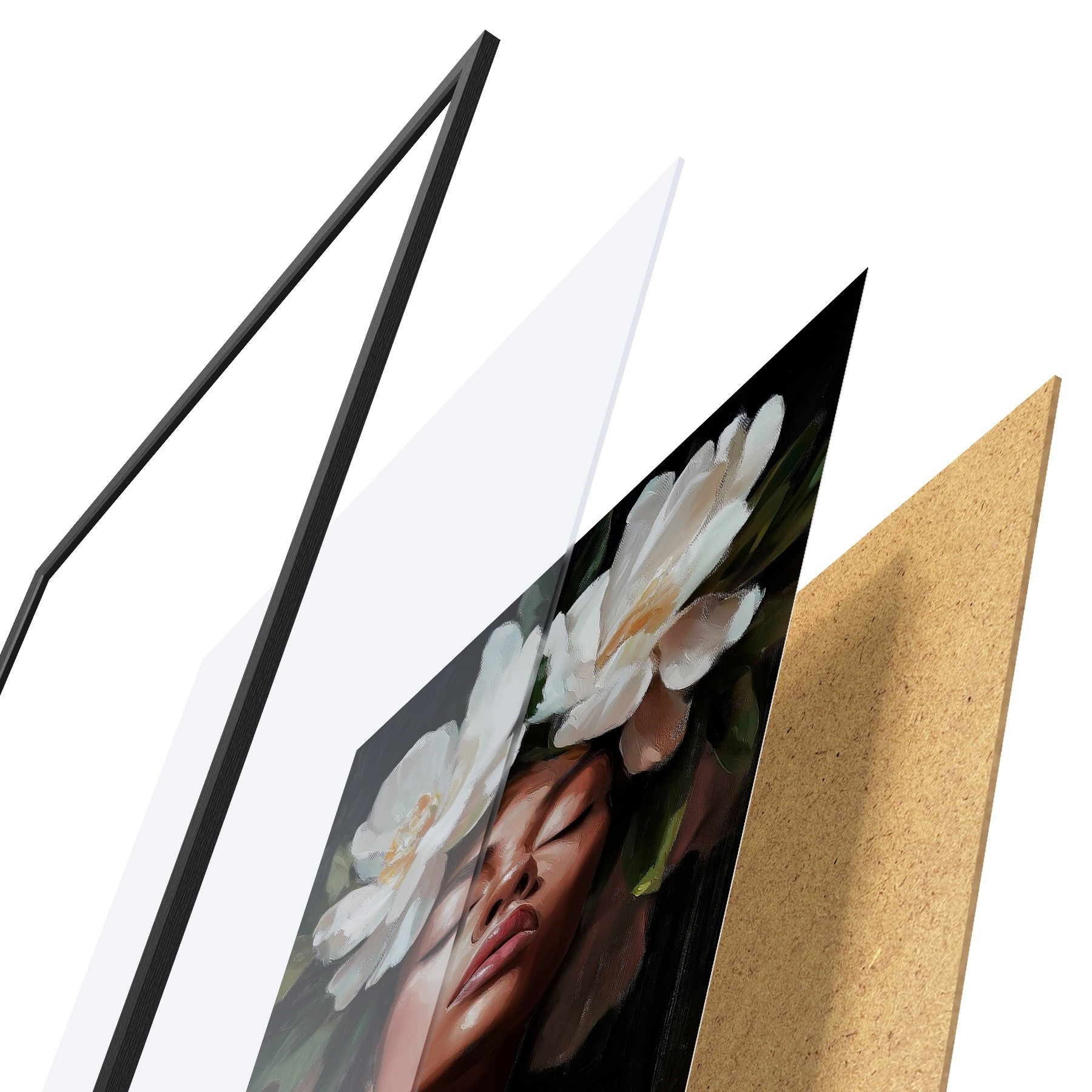 Das Poster besteht aus einem Rahmen, Plexiglas, einem gedruckten Bild und einer Rückwand aus Spanplatten. Dank der Halterungen auf der Rückseite kann das Poster sofort an die Wand gehängt werden.