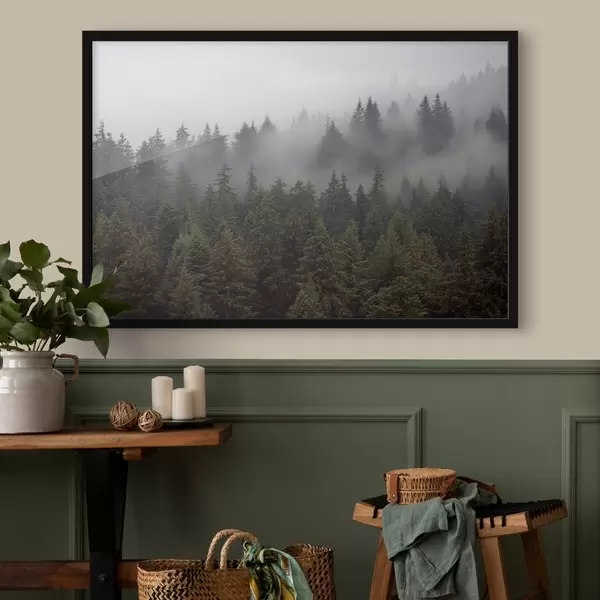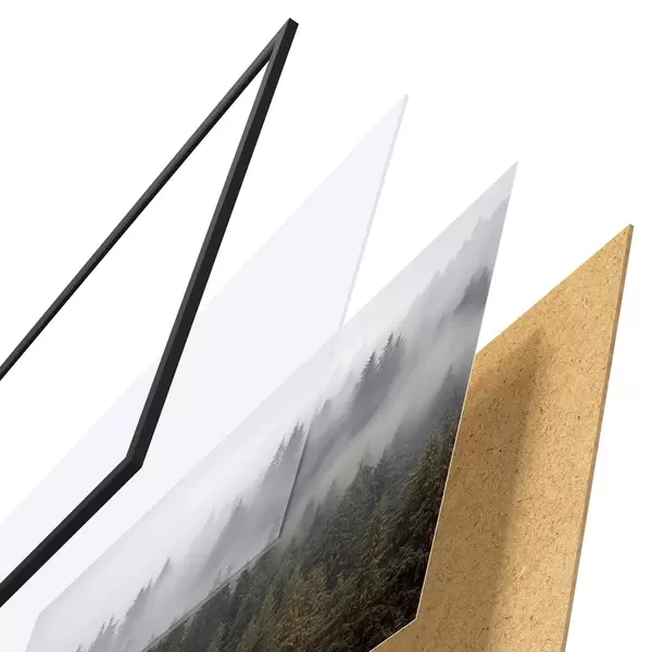 Das Poster besteht aus einem Rahmen, Plexiglas, einem gedruckten Bild und einer Rückwand aus Spanplatten. Dank der Halterungen auf der Rückseite kann das Poster sofort an die Wand gehängt werden.