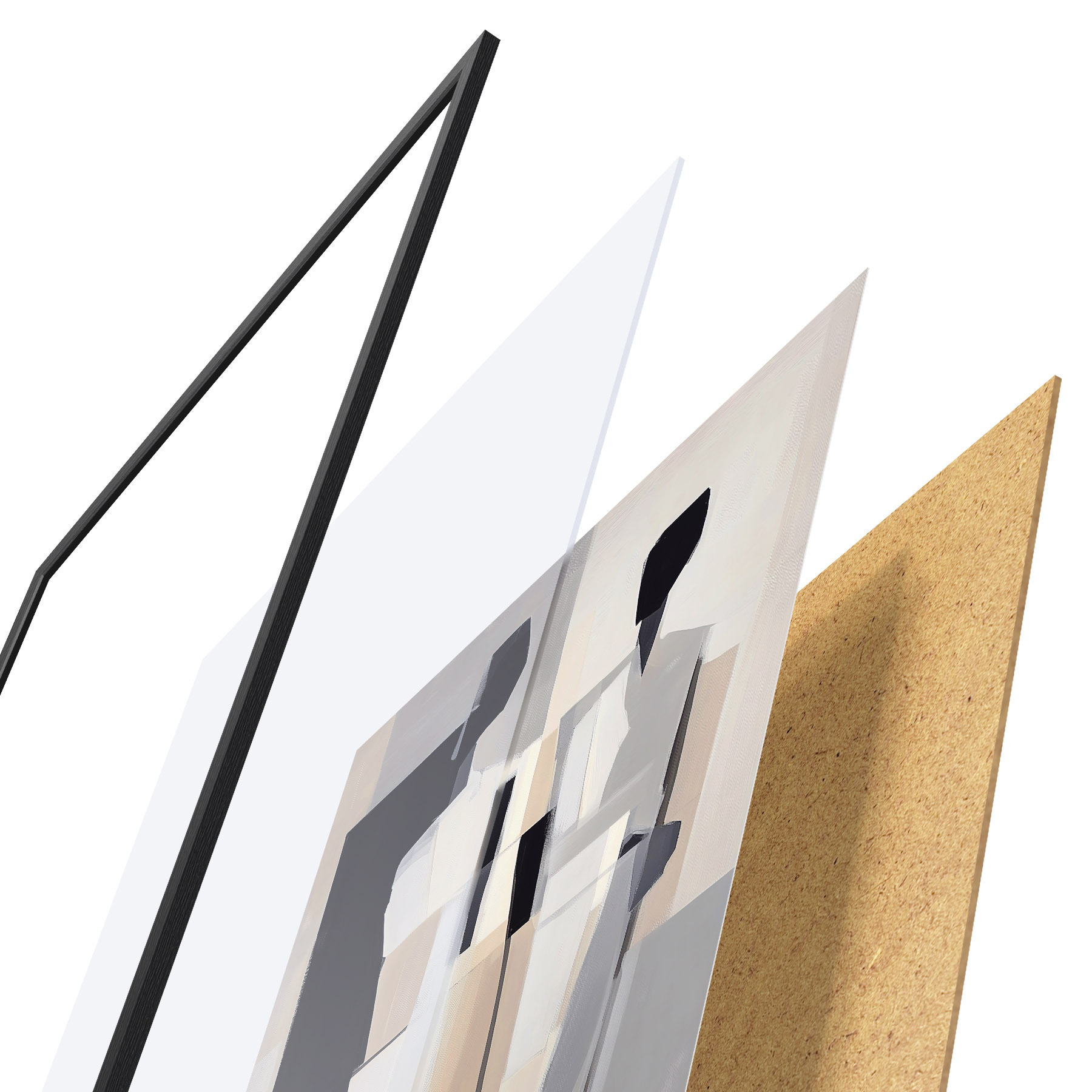 Das Poster besteht aus einem Rahmen, Plexiglas, einem gedruckten Bild und einer Rückwand aus Spanplatten. Dank der Halterungen auf der Rückseite kann das Poster sofort an die Wand gehängt werden.