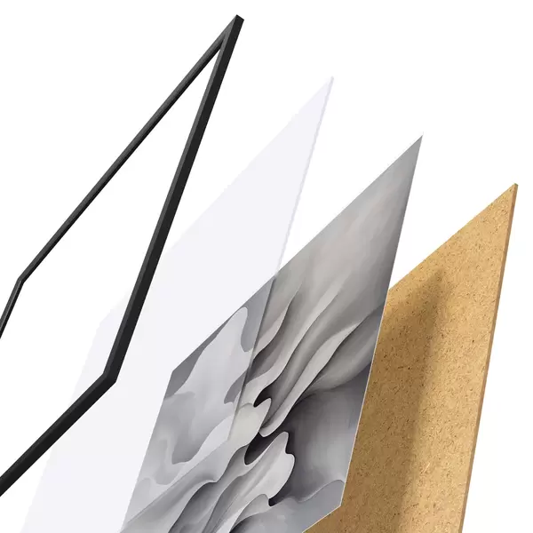 Das Poster besteht aus einem Rahmen, Plexiglas, einem gedruckten Bild und einer Rückwand aus Spanplatten. Dank der Halterungen auf der Rückseite kann das Poster sofort an die Wand gehängt werden.