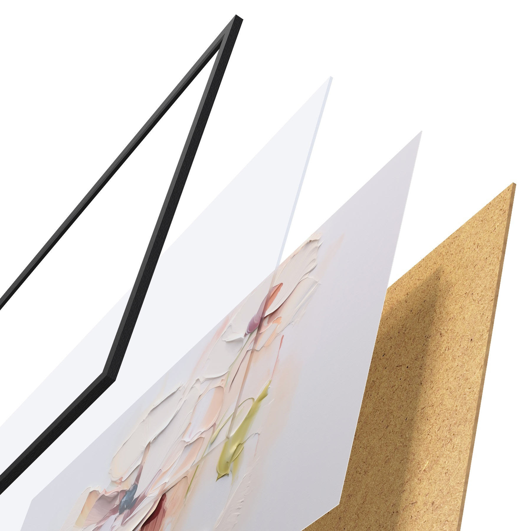 Das Poster besteht aus einem Rahmen, Plexiglas, einem gedruckten Bild und einer Rückwand aus Spanplatten. Dank der Halterungen auf der Rückseite kann das Poster sofort an die Wand gehängt werden.