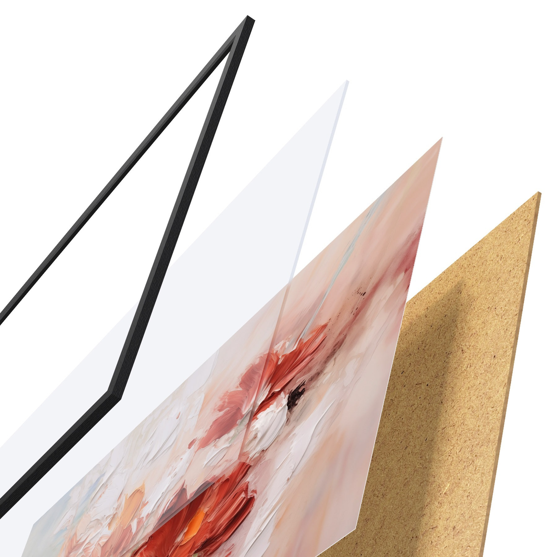 Das Poster besteht aus einem Rahmen, Plexiglas, einem gedruckten Bild und einer Rückwand aus Spanplatten. Dank der Halterungen auf der Rückseite kann das Poster sofort an die Wand gehängt werden.