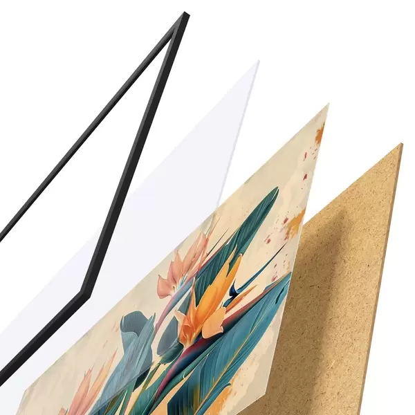 Das Poster besteht aus einem Rahmen, Plexiglas, einem gedruckten Bild und einer Rückwand aus Spanplatten. Dank der Halterungen auf der Rückseite kann das Poster sofort an die Wand gehängt werden.