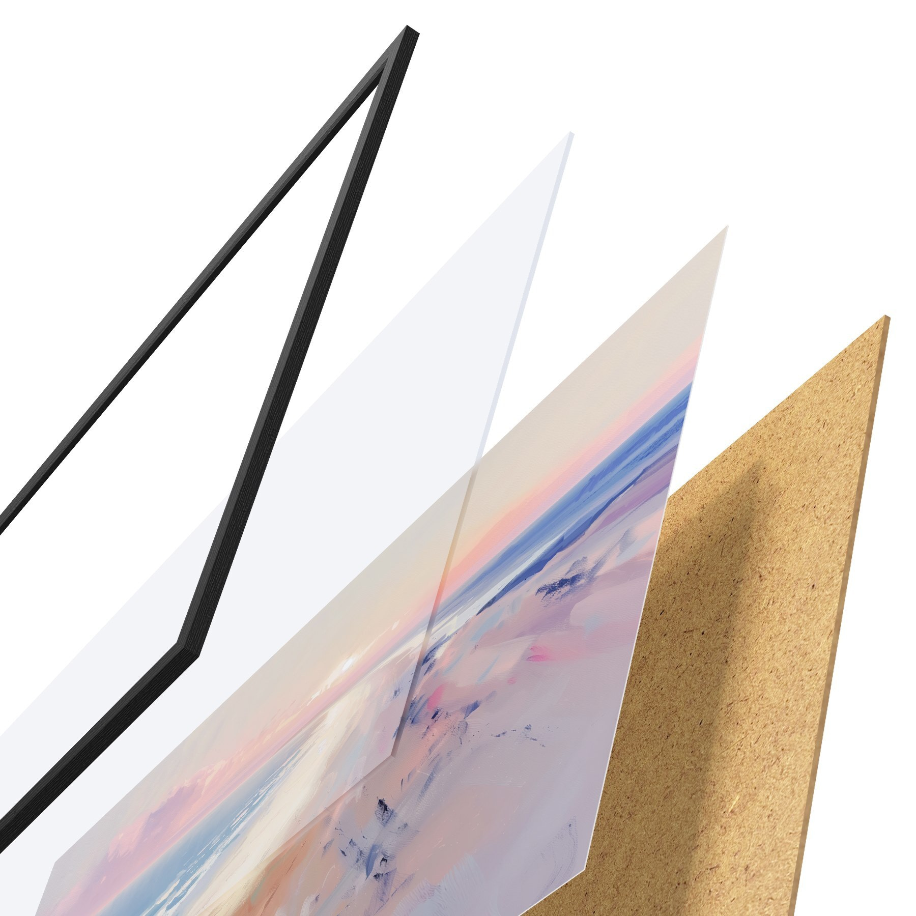 Das Poster besteht aus einem Rahmen, Plexiglas, einem gedruckten Bild und einer Rückwand aus Spanplatten. Dank der Halterungen auf der Rückseite kann das Poster sofort an die Wand gehängt werden.