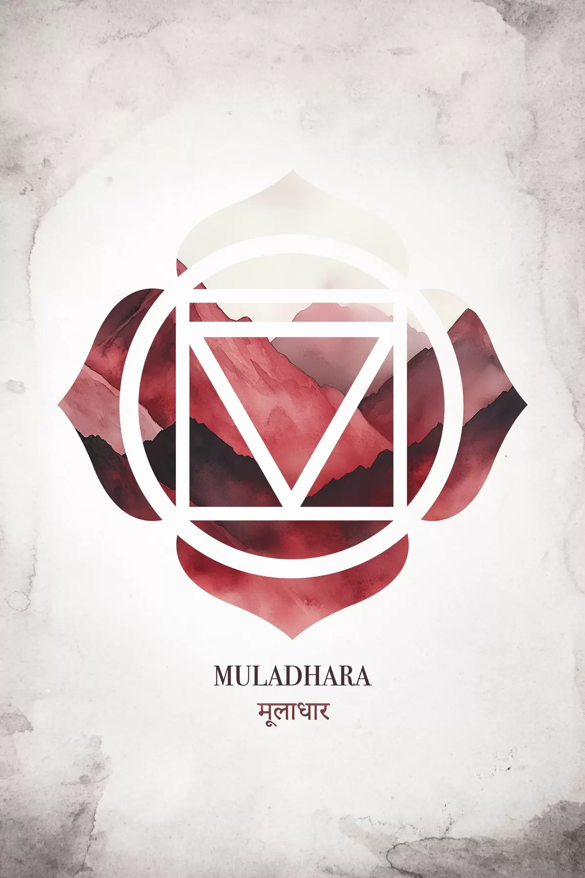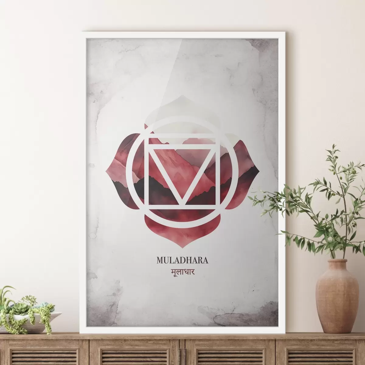 Poster Muladhara-Chakra, rotes Chakra, Esoterik, Meditation, Buddhismus, Berge im Aquarellstil f41880
