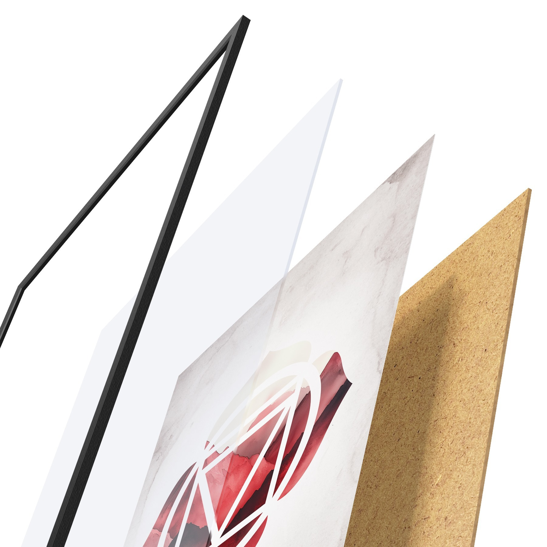 Das Poster besteht aus einem Rahmen, Plexiglas, einem gedruckten Bild und einer Rückwand aus Spanplatten. Dank der Halterungen auf der Rückseite kann das Poster sofort an die Wand gehängt werden.