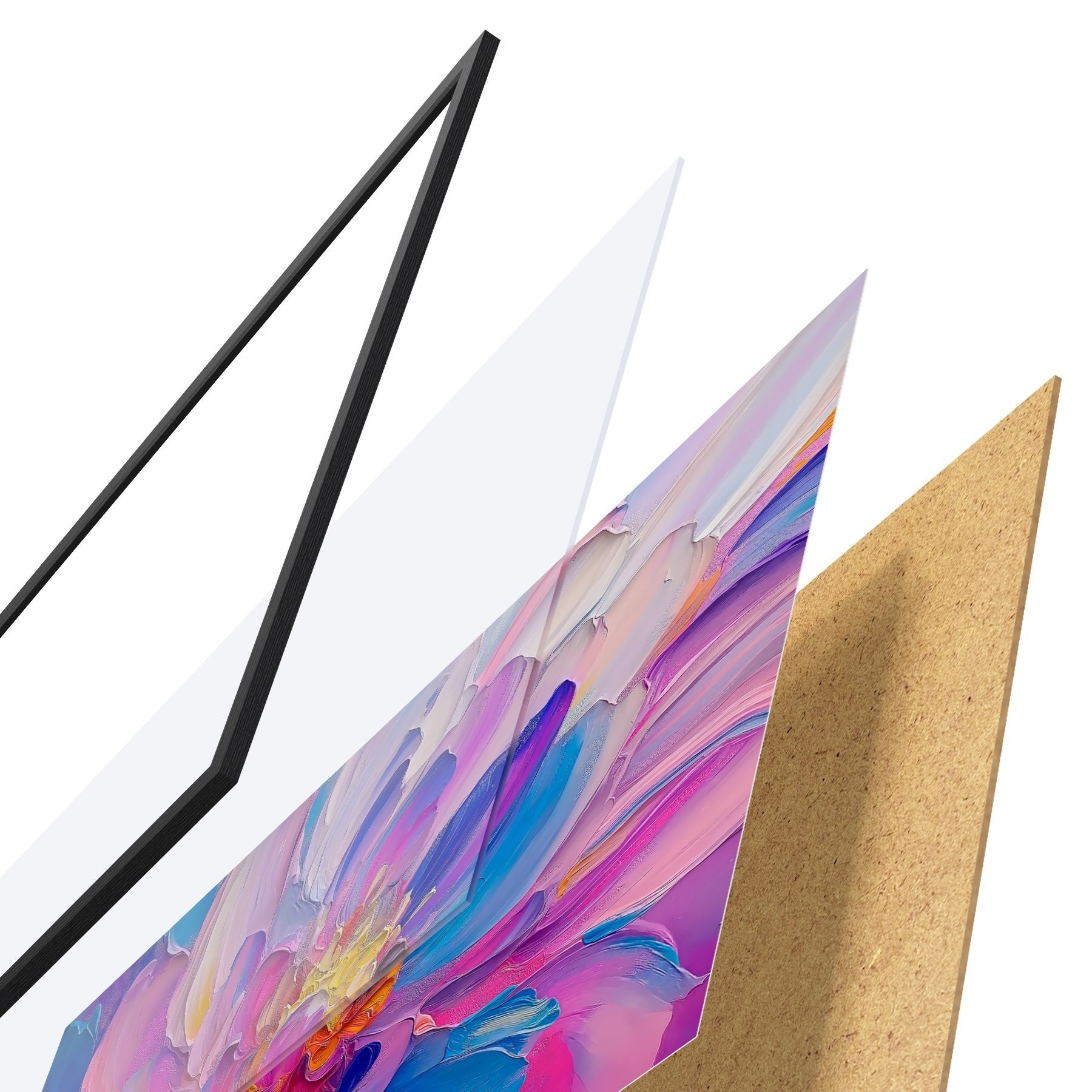 Das Poster besteht aus einem Rahmen, Plexiglas, einem gedruckten Bild und einer Rückwand aus Spanplatten. Dank der Halterungen auf der Rückseite kann das Poster sofort an die Wand gehängt werden.