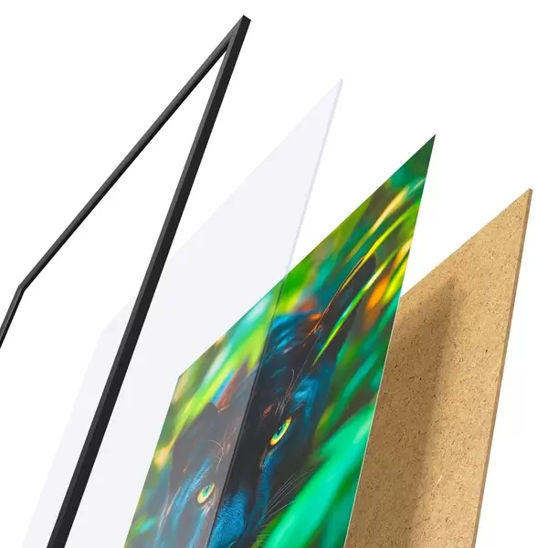 Das Poster besteht aus einem Rahmen, Plexiglas, einem gedruckten Bild und einer Rückwand aus Spanplatten. Dank der Halterungen auf der Rückseite kann das Poster sofort an die Wand gehängt werden.