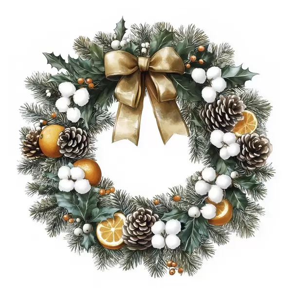 Poster Weihnachtskranz mit Schleife, Baumwolle, Orangen, Beeren und Zapfen f41962