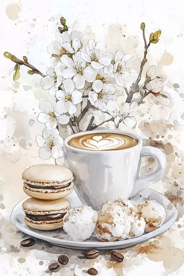 Poster Schöne Tasse Kaffee, Jasminblüten, Makronen, weiche Aquarellfarben Nr f41964