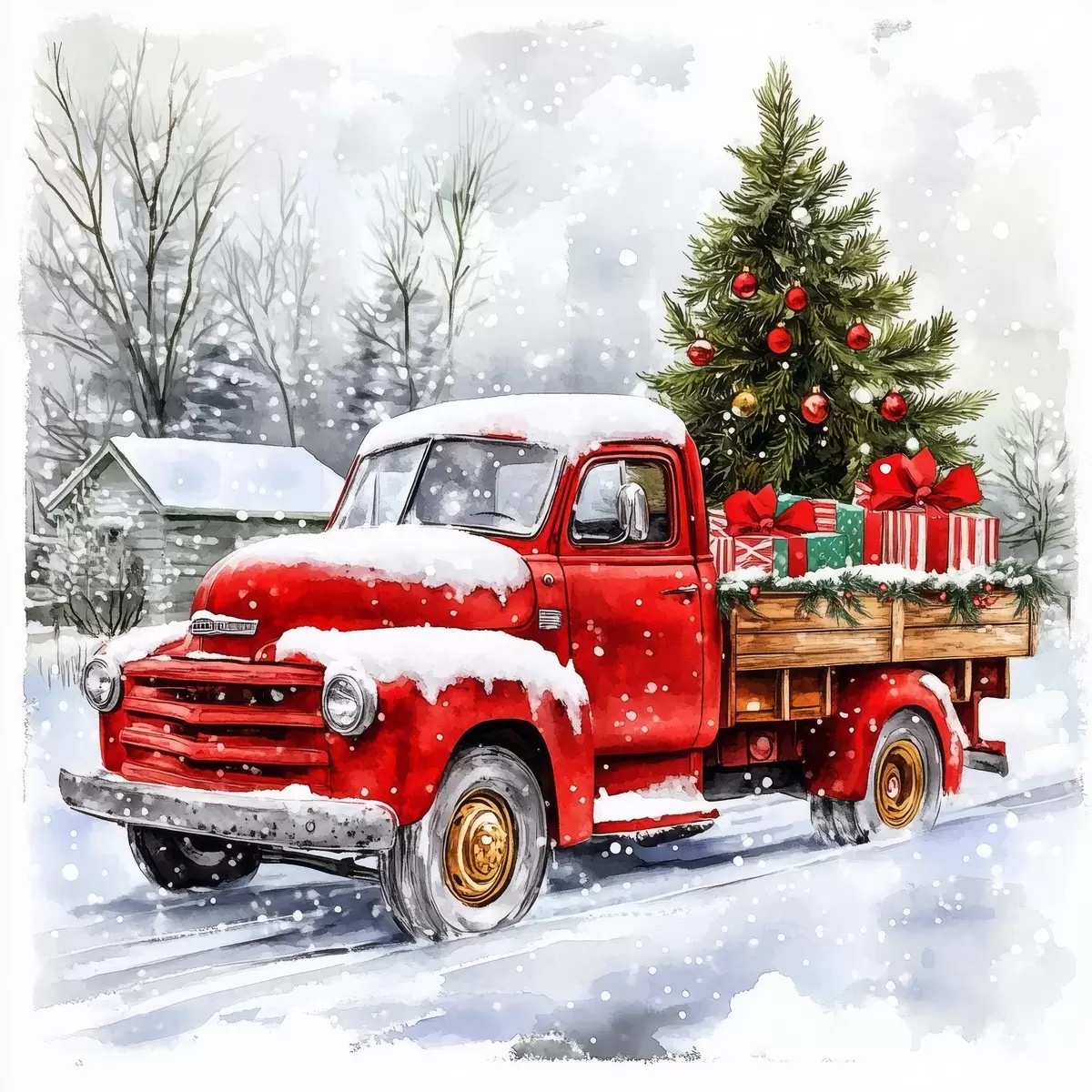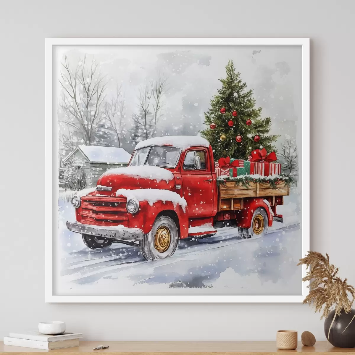 Poster Ein Weihnachtsauto mit einem Baum und Geschenken bei verschneitem Wetter Nr f41968