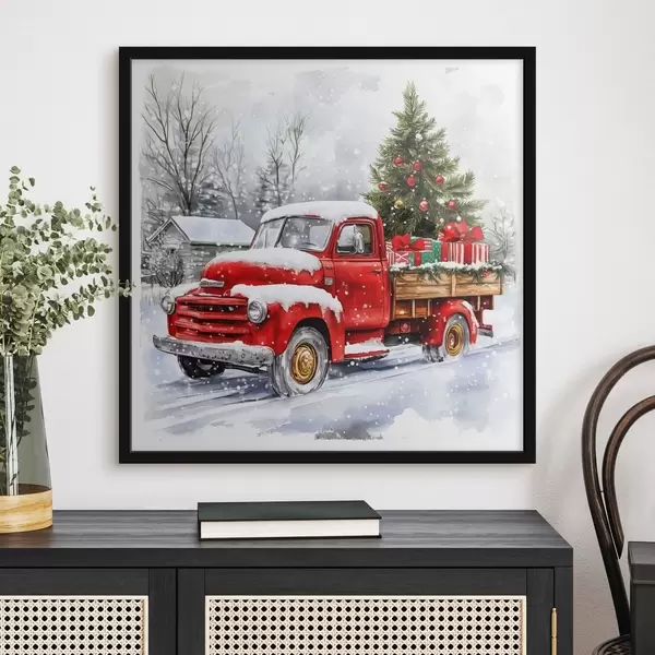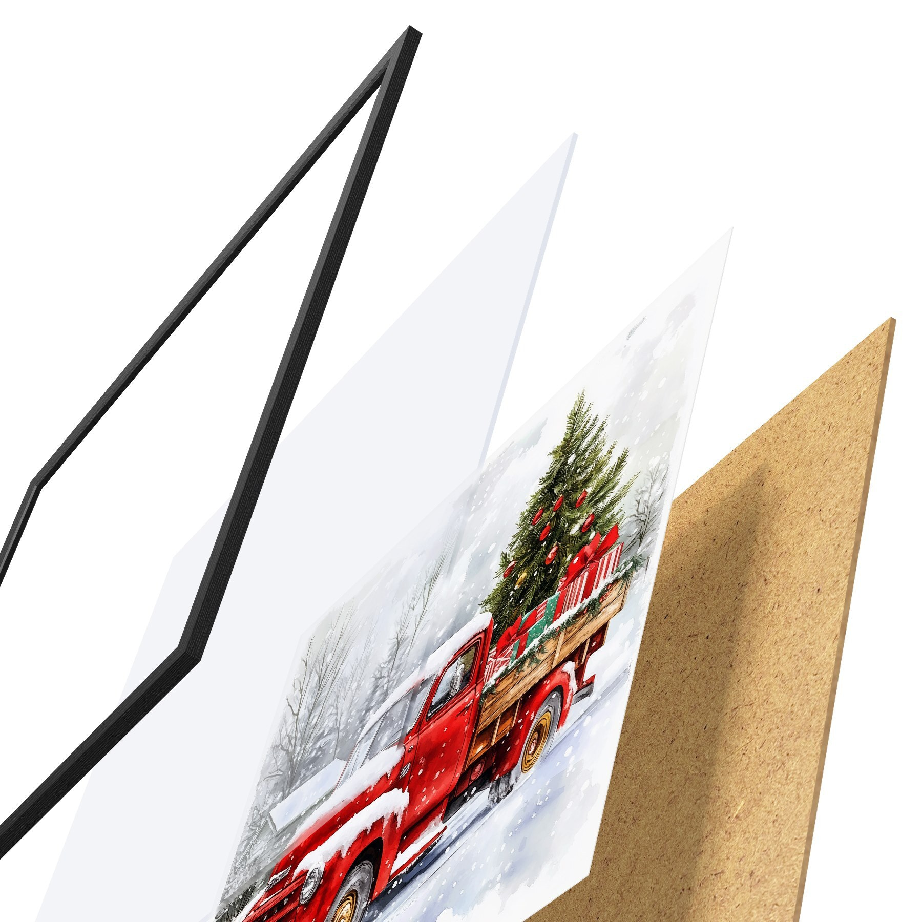 Poster Ein Weihnachtsauto mit einem Baum und Geschenken bei verschneitem Wetter f41968