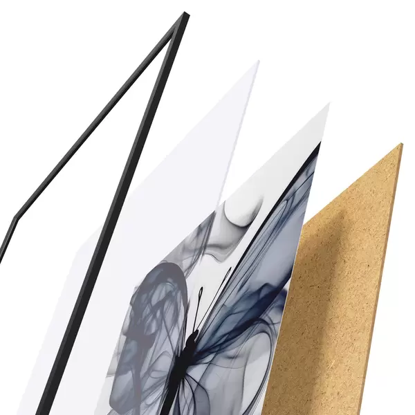Das Poster besteht aus einem Rahmen, Plexiglas, einem gedruckten Bild und einer Rückwand aus Spanplatten. Dank der Halterungen auf der Rückseite kann das Poster sofort an die Wand gehängt werden.