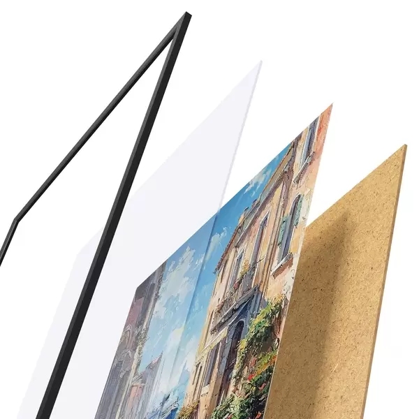 Das Poster besteht aus einem Rahmen, Plexiglas, einem gedruckten Bild und einer Rückwand aus Spanplatten. Dank der Halterungen auf der Rückseite kann das Poster sofort an die Wand gehängt werden.