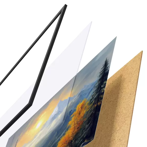 Das Poster besteht aus einem Rahmen, Plexiglas, einem gedruckten Bild und einer Rückwand aus Spanplatten. Dank der Halterungen auf der Rückseite kann das Poster sofort an die Wand gehängt werden.