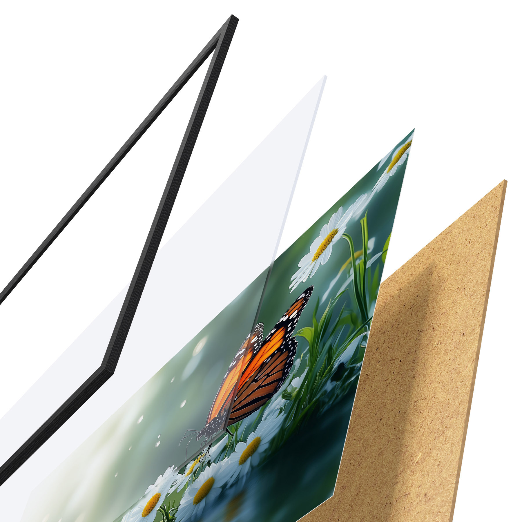 Das Poster besteht aus einem Rahmen, Plexiglas, einem gedruckten Bild und einer Rückwand aus Spanplatten. Dank der Halterungen auf der Rückseite kann das Poster sofort an die Wand gehängt werden.