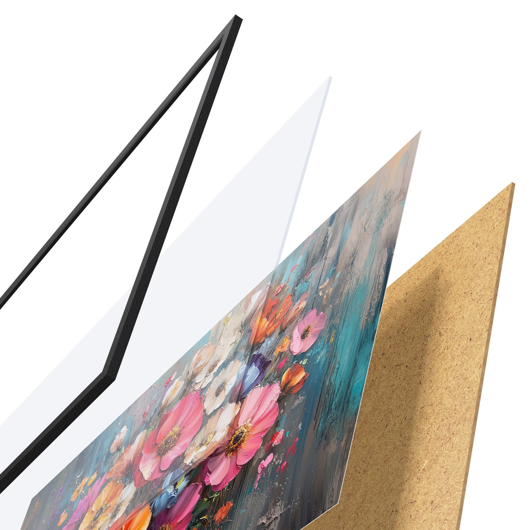 Das Poster besteht aus einem Rahmen, Plexiglas, einem gedruckten Bild und einer Rückwand aus Spanplatten. Dank der Halterungen auf der Rückseite kann das Poster sofort an die Wand gehängt werden.