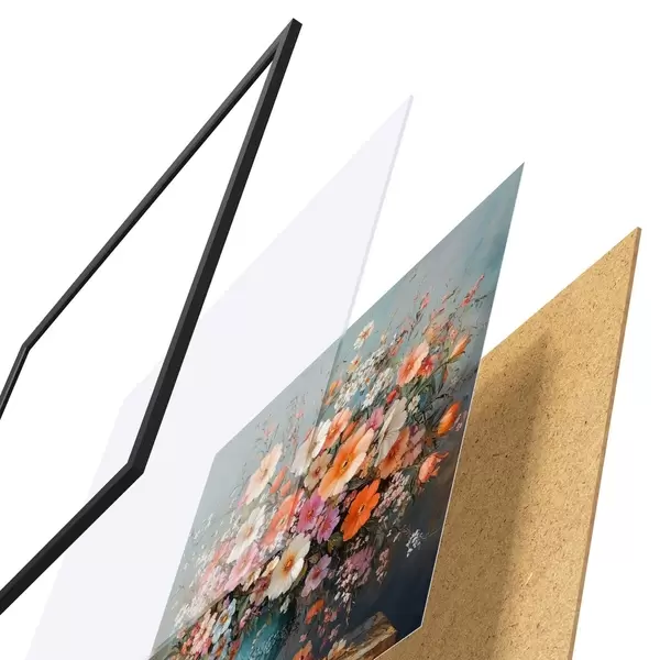 Das Poster besteht aus einem Rahmen, Plexiglas, einem gedruckten Bild und einer Rückwand aus Spanplatten. Dank der Halterungen auf der Rückseite kann das Poster sofort an die Wand gehängt werden.