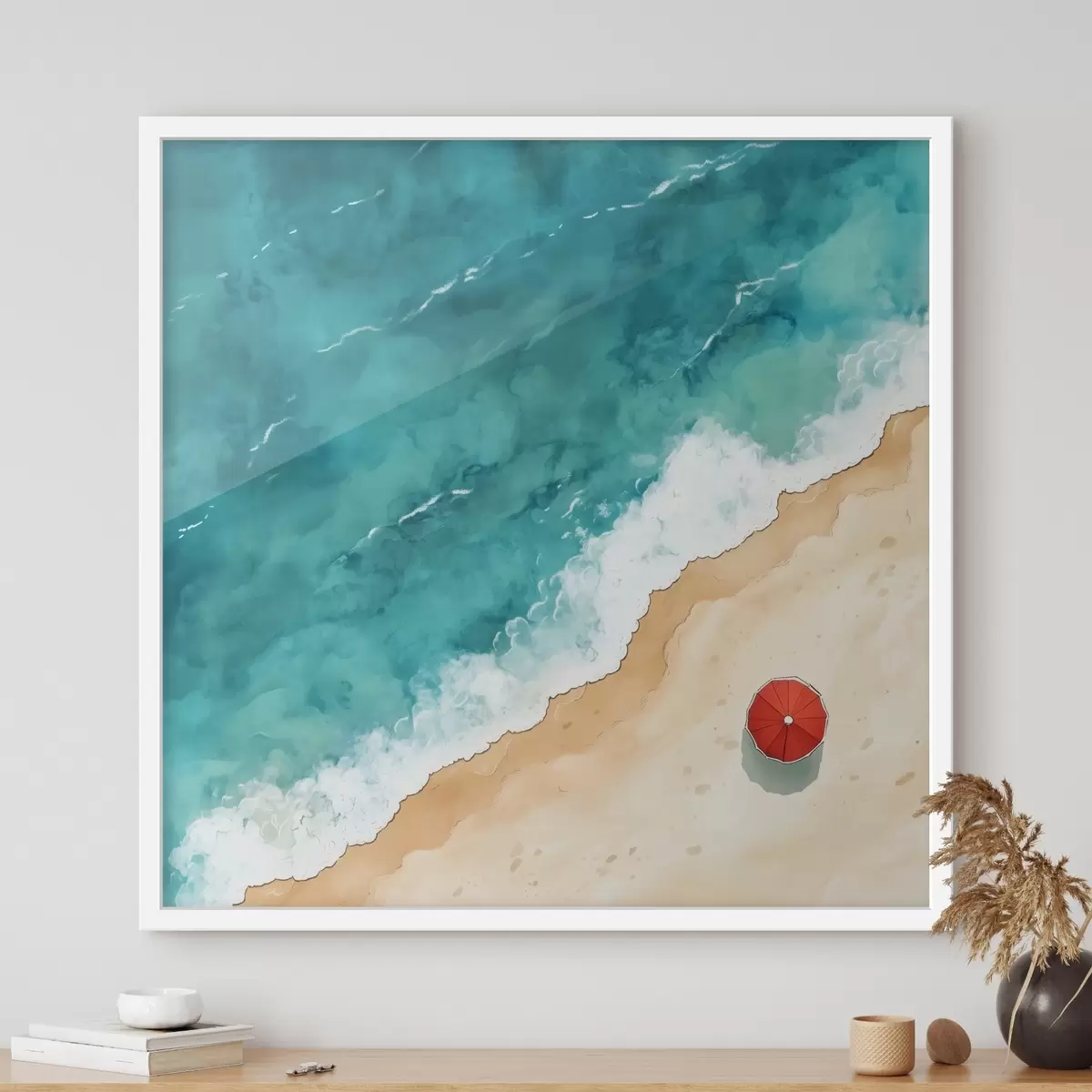 Poster Ein Sandstrand mit dem Meer und einem roten Sonnenschirm, Ansicht von oben Nr f42040