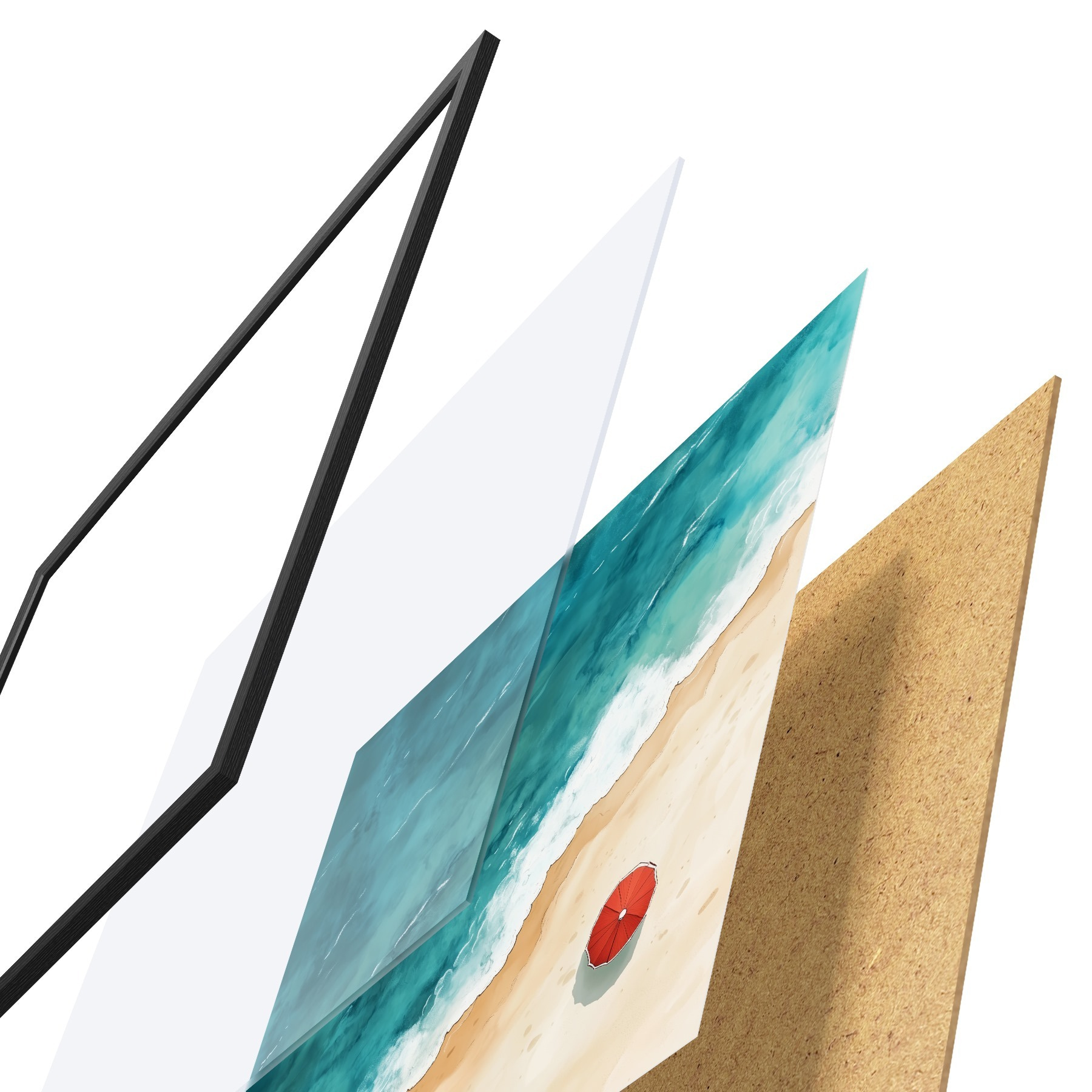 Das Poster besteht aus einem Rahmen, Plexiglas, einem gedruckten Bild und einer Rückwand aus Spanplatten. Dank der Halterungen auf der Rückseite kann das Poster sofort an die Wand gehängt werden.