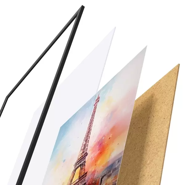 Das Poster besteht aus einem Rahmen, Plexiglas, einem gedruckten Bild und einer Rückwand aus Spanplatten. Dank der Halterungen auf der Rückseite kann das Poster sofort an die Wand gehängt werden.