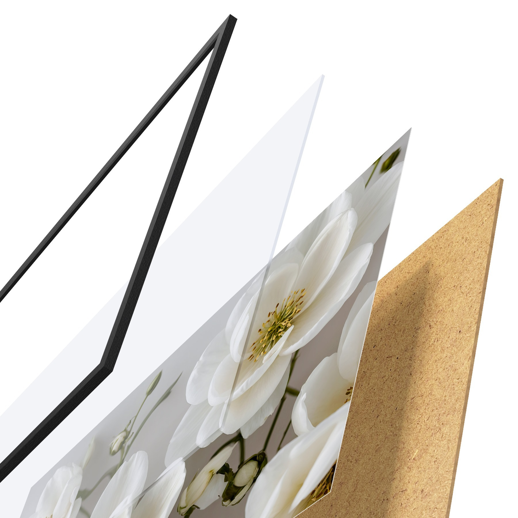 Das Poster besteht aus einem Rahmen, Plexiglas, einem gedruckten Bild und einer Rückwand aus Spanplatten. Dank der Halterungen auf der Rückseite kann das Poster sofort an die Wand gehängt werden.