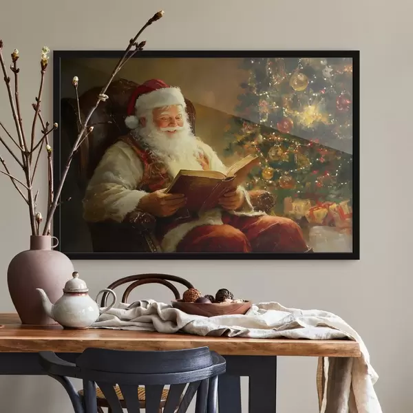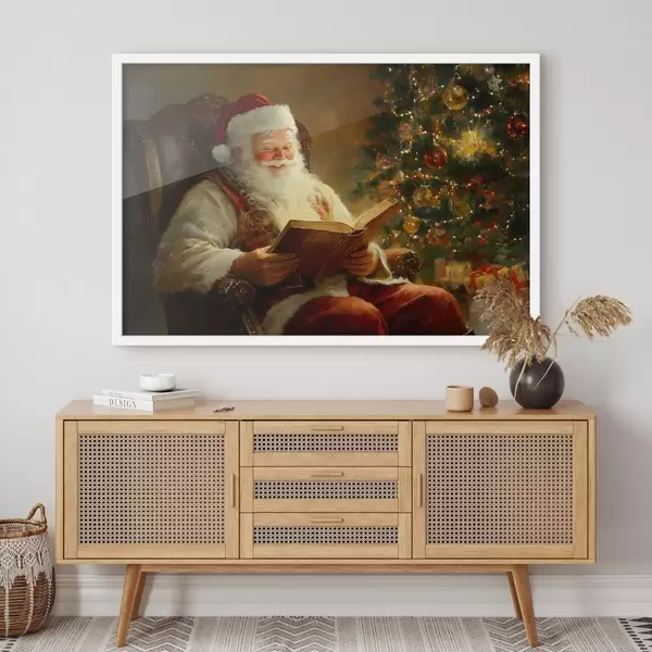 Poster Der Weihnachtsmann liest ein Buch in der Nähe des Weihnachtsbaums Nr f42100