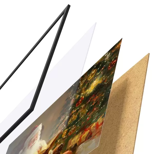 Das Poster besteht aus einem Rahmen, Plexiglas, einem gedruckten Bild und einer Rückwand aus Spanplatten. Dank der Halterungen auf der Rückseite kann das Poster sofort an die Wand gehängt werden.