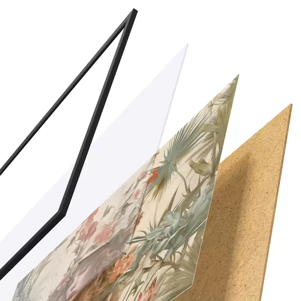 Das Poster besteht aus einem Rahmen, Plexiglas, einem gedruckten Bild und einer Rückwand aus Spanplatten. Dank der Halterungen auf der Rückseite kann das Poster sofort an die Wand gehängt werden.