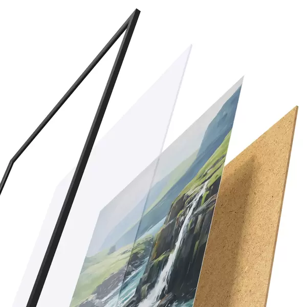 Das Poster besteht aus einem Rahmen, Plexiglas, einem gedruckten Bild und einer Rückwand aus Spanplatten. Dank der Halterungen auf der Rückseite kann das Poster sofort an die Wand gehängt werden.